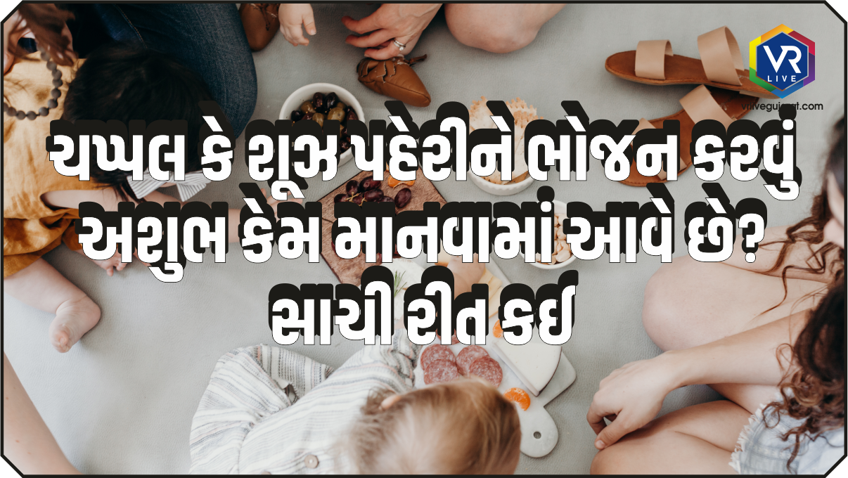 Gujarati Culture ચપ્પલ કે શૂઝ પહેરીને ભોજન કરવું અશુભ કેમ માનવામાં આવે છે? જાણો ધાર્મિક અને વૈજ્ઞાનિક કારણ. રે ભોજન માટે ચપ્પલ અથવા શૂઝ વગર જ રસોડું અને ડાઇનિંગ ટેબલ પર જવું જોઈએ! આજકાલ ઘણી વખત લોકો સમયની અછત કે આદતના કારણે ચપ્પલ કે જૂતાં પહેરીને જમવા બેસી જાય છે, પરંતુ આ પરંપરા મુજબ યોગ્ય માનવામાં આવતું નથી.