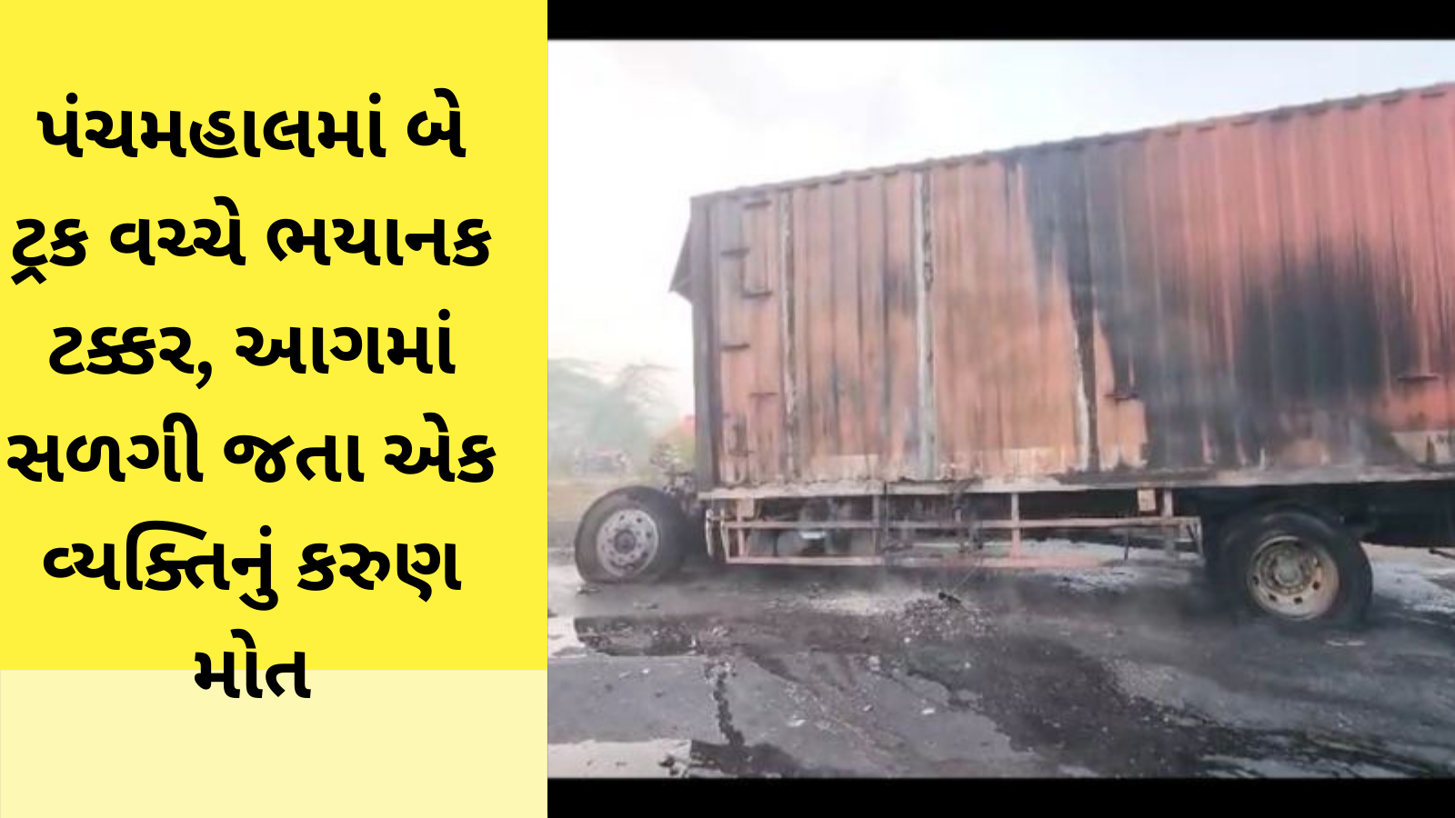Panchmahal Accident :પંચમહાલ જિલ્લાના ગોધરા તાલુકામાં શુક્રવારે વહેલી સવારે કાળજું કંપાવી દે તેવી ભયાનક માર્ગ દુર્ઘટના સર્જાઈ હતી. ગોધરાના ડોક્ટરના મુવાડા ગામ નજીક બે ટ્રકો વચ્ચે જોરદાર ટક્કર થતાં એક ટ્રકમાં અચાનક ભીષણ આગ ફાટી નીકળી હતી. આ અકસ્માતમાં ટ્રકની કેબિનમાં ફસાયેલા એક વ્યક્તિનું આગમાં સળગી જતા ઘટનાસ્થળે જ કરુણ મોત નીપજ્યું હતું.