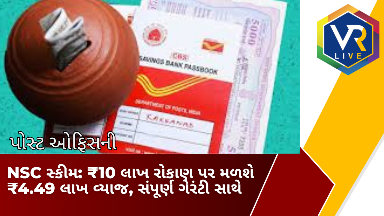 Post Office scheme :જો તમે સુરક્ષિત અને ગેરંટીવાળું રોકાણ શોધી રહ્યા હો, તો પોસ્ટ ઓફિસની રાષ્ટ્રીય બચત પ્રમાણપત્ર (NSC – National Savings Certificate) યોજના તમારા માટે ઉત્તમ વિકલ્પ બની શકે છે. આ યોજના હેઠળ ₹10 લાખનું રોકાણ કરવાથી પાકવા સમયે તમને આશરે ₹4,49,034 વ્યાજ મળી શકે છે.