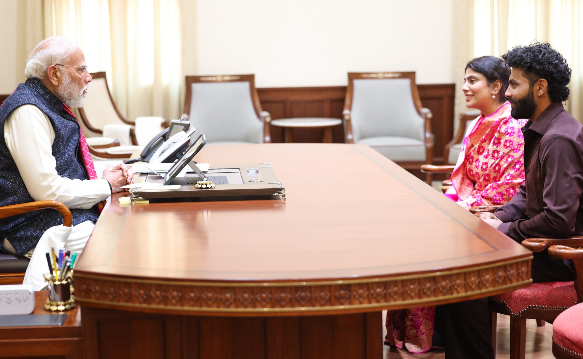મુલાકાત દરમિયાન રવિન્દ્ર જાડેજાએ વડાપ્રધાનને પુષ્પગુચ્છ અર્પણ કર્યો હતો, જ્યારે રિવાબા જાડેજાએ તેમને શાલ ઓઢાડી સન્માનિત કર્યા હતા. રિવાબાએ આ મુલાકાતને ગર્વની ક્ષણ ગણાવી હતી. બંનેએ મુલાકાતની તસવીરો પોતાના સોશિયલ મીડિયા એકાઉન્ટ પર શેર કરતાં આ પ્રસંગને યાદગાર ગણાવ્યો હતો.