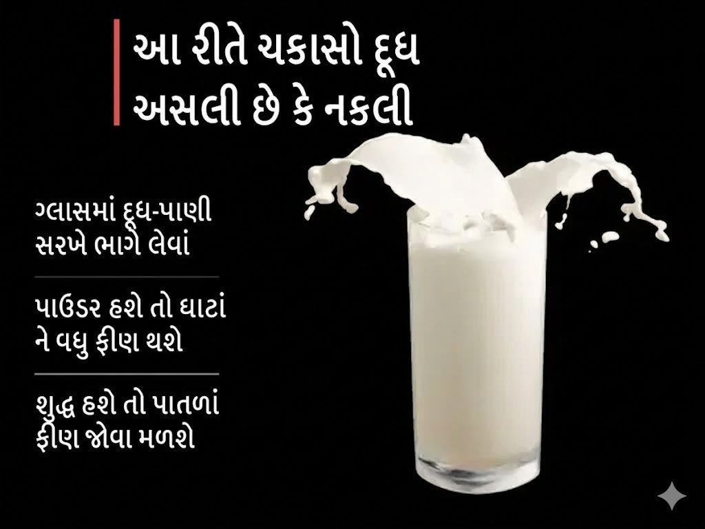 • ડિટર્જન્ટની તપાસ: દૂધ અને પાણી સમાન માત્રામાં લઈ બોટલમાં હલાવો. જો જાડા ફીણ વળે, તો દૂધમાં ડિટર્જન્ટ હોઈ શકે છે.
